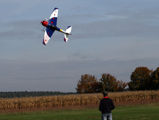 Die zweimetersechzig Yak SP-55M gehört wohl zu den besten Flieger in dieser Größe auf dem Markt. Durch den hohen Stirnwiderstand besticht sie mit einem sehr guten Bremsverhalten in den Abwärtspassagen. Dadurch ist der gewünschte "konstant Speed" im Kunstflug leichter zu erreichen. Elektronische Mischer am Sender nach dem Motto: "Seite > Quer" oder "Seite > Höhe" kann man bei der Yak vergessen. Messerflüge und gerissene Rollen zählen definitiv zu den Stärken dieser tollen Maschine. Das Finish im individuellen Design gibt es so nicht "von der Stange". Ergänzt durch klassische Radverkleidungen und eine Kabinenhaube aus Kohlefasergewebe hat diese Yak einen hohen Wiedererkennungswert und behält am Platz ihre Einzigartigkeit. Der Innenausbau erfolgte bei meiner Maschine aus GfK-Waben-Sandwich. Das gibt den darauf verbauten Komponenten sicheren Halt auf lange Zeit und sieht deutlich besser aus. Im Laufe der Zeit hatte ich Gelegenheit, in Zusammenarbeit mit dem BMB-Dämpfer-Team, eine Motor-/Abgaskombination zu verbauen, die sowohl Kraftvoll wie auch leise daher kommt. Es kam ein DA-100 mit zwei 70mm BMB Competition XL 3D Dämpfern und einer 29 x 12 SS von Engel zum Einsatz. Wie man in den letzten Videos erkennen kann: echt empfehlenswert. Als Smoke-Pumpe hatte ich die APS 300 verbaut. Diese hat ein integriertes Magnet-Abschaltventil und lässt nur dann Öl fließen, wann man es will. Außerdem ist sie selbst ansaugend, per Mischer stufenlos einstellbar und hat die Möglichkeit, getrennt mit Strom versorgt zu werden. Für die Ansteuerung sämtlicher Steuerruder hatte ich mich für die Hitec HS-5945 Digital entschieden. Versorgt über das Emcotec-DPSI-System haben sie sich durch eine sehr gute Stellkraft und Langlebigkeit qualifiziert. Der Nachteil ist hier, dass sie recht schnell ein leichtes Spiel in der Nulllage entwickeln. Dieses Spiel wird allerdings nicht größer und hat keinen rtkrnnbaren Einfluss auf das Modell.