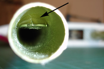 Der eingeklebte Balsaklotz hat leider keine Verbindung mit der Außenhaut. Da muss nachgeklebt werden. |